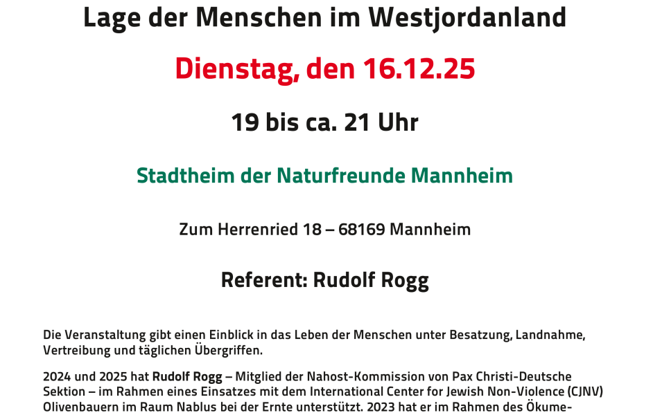 Wir freuen uns, an diesem Abend Rudolf Rogg bei den NaturFreunden Mannheim zu Gast zu haben. Er war unter anderem  Landesdirektor der Deutschen Gesellschaft für Internationale Zusammenarbeit (giz) und engagiert sich bis heute in  Menschenrechts- und Friedensorganisationen in Palästina. Er kann uns so einen authentischen Eindruck von der aktuellen Lage im Westjordanland  und den Herausforderungen vermitteln.
